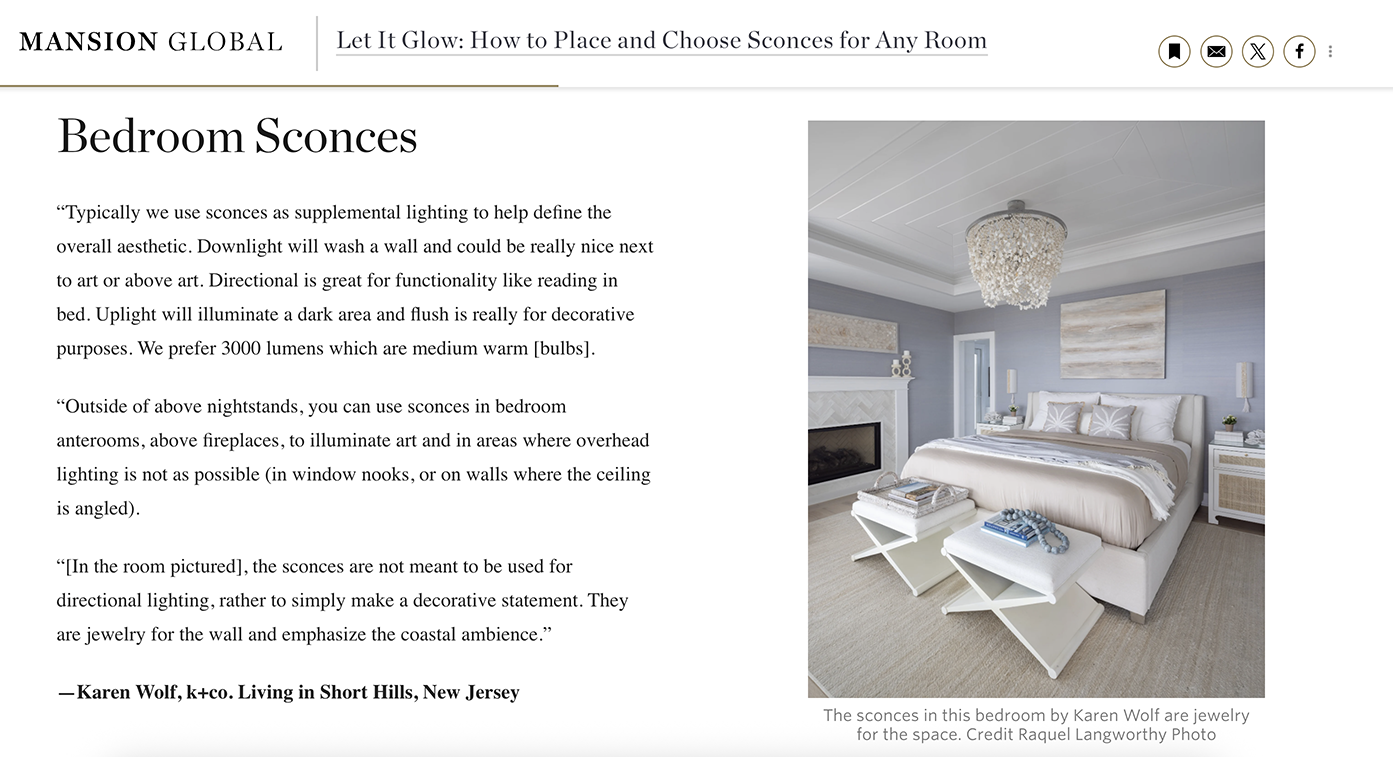 K+CO Living is so excited to be featured on Mansion Global’ “Let It Glow: How to Place and Choose Sconces for Any Room”